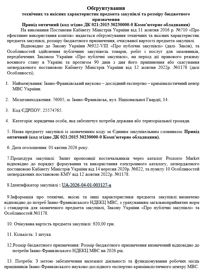 Опубліковано 1 Квітня, 20262 Квітня, 2026 автором ndekcifuaОбґрунтування до закупівлі за предметом закупівлі – Привід оптичний (код згідно ДК 021:2015 30230000-0 Комп’ютерне обладнання)