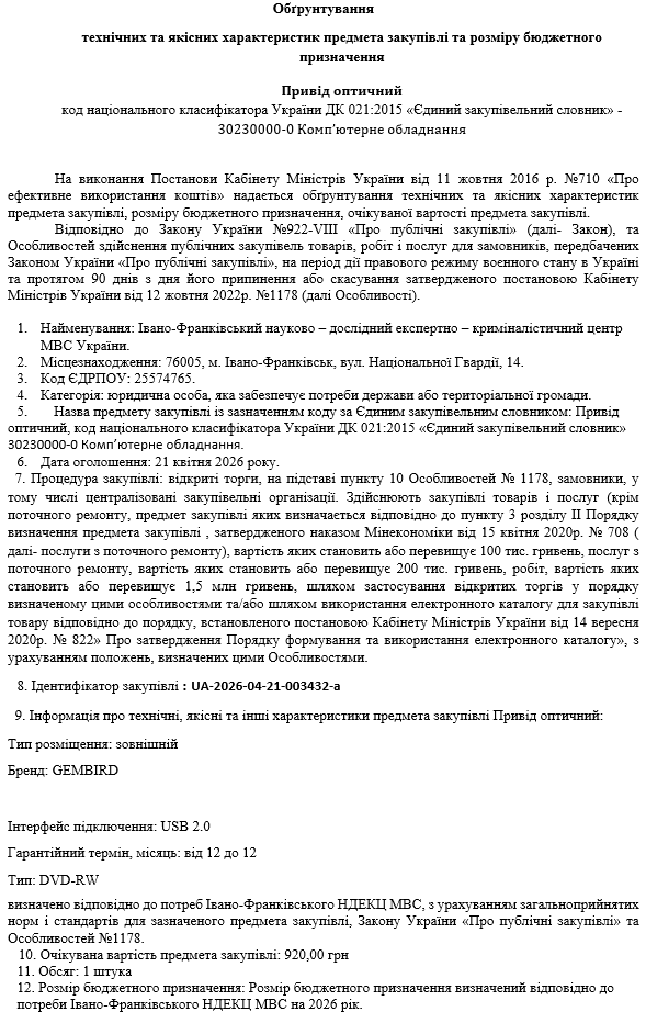 Обґрунтування до закупівлі за предметом закупівлі – Привід оптичний (код згідно ДК 021:2015 30230000-0 Комп’ютерне обладнання)